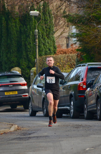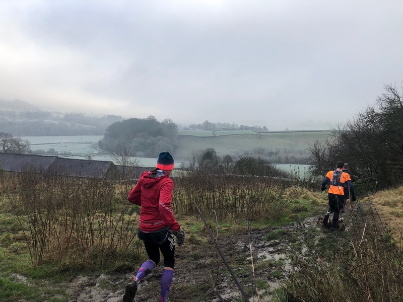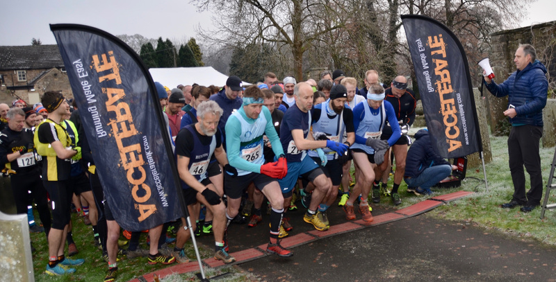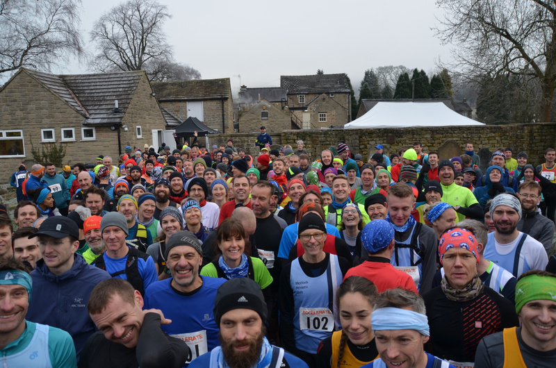 The inaugural Baslow Bolt fell race was held on Saturday 30th November 2019. The recent heavy rains had subsided, to be replaced with frost and fog; so that the mud was mainly firm, but there remained some cold watery sections along the 7.5 mile (12 km) course. Fun conditions for a hilly fell race! About 250 committed fell runners, aged between 18 and 80, gathered at the start in the churchyard at 10am for a briefing by race organisers Ian White & Richard Conroy (supported by a committed and hard working committee and about 40 marshal volunteers dotted around the course).