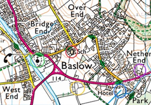 The public car park is at the blue circle on the map below. Public toilets also available at this car park. DE45 1SS The Bowls Club car park is at the yellow circle. DE45 1SP The Wheatsheaf Hotel is at the purple circle. DE45 1SR Registration, bag drop, toilets, race finish and refreshments are at the school (red circle). DE45 1RZ Race start is at the church (green circle). DE45 1RY